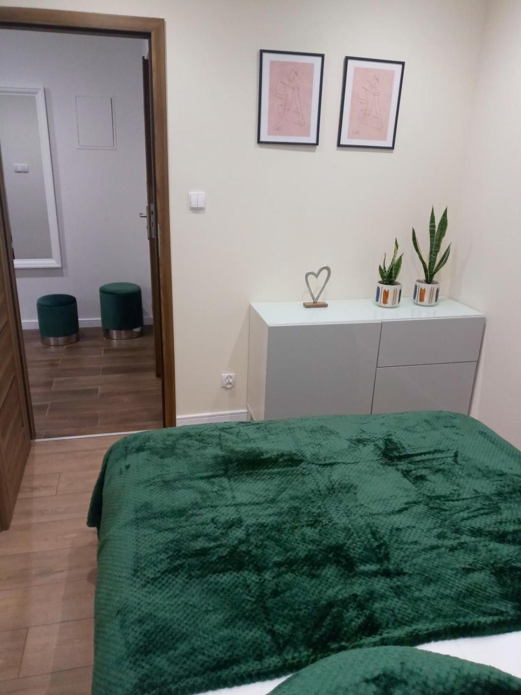 Apartament z 1 sypialnią. This apartment comprises 1 living room, 1 separate bedroom and 1 bathroom with a shower and a hairdryer. In the well-fitted kitchenette, guests will find a stovetop, a refrigerator, kitchenware and an electric kettle. The apartment provides a flat-screen TV, a dining area, a wardrobe, heating as well as garden views. The unit offers 2 beds. Apartament - 3 osobowy. Powierzchnia pokoju ok.: 40 mkw.
