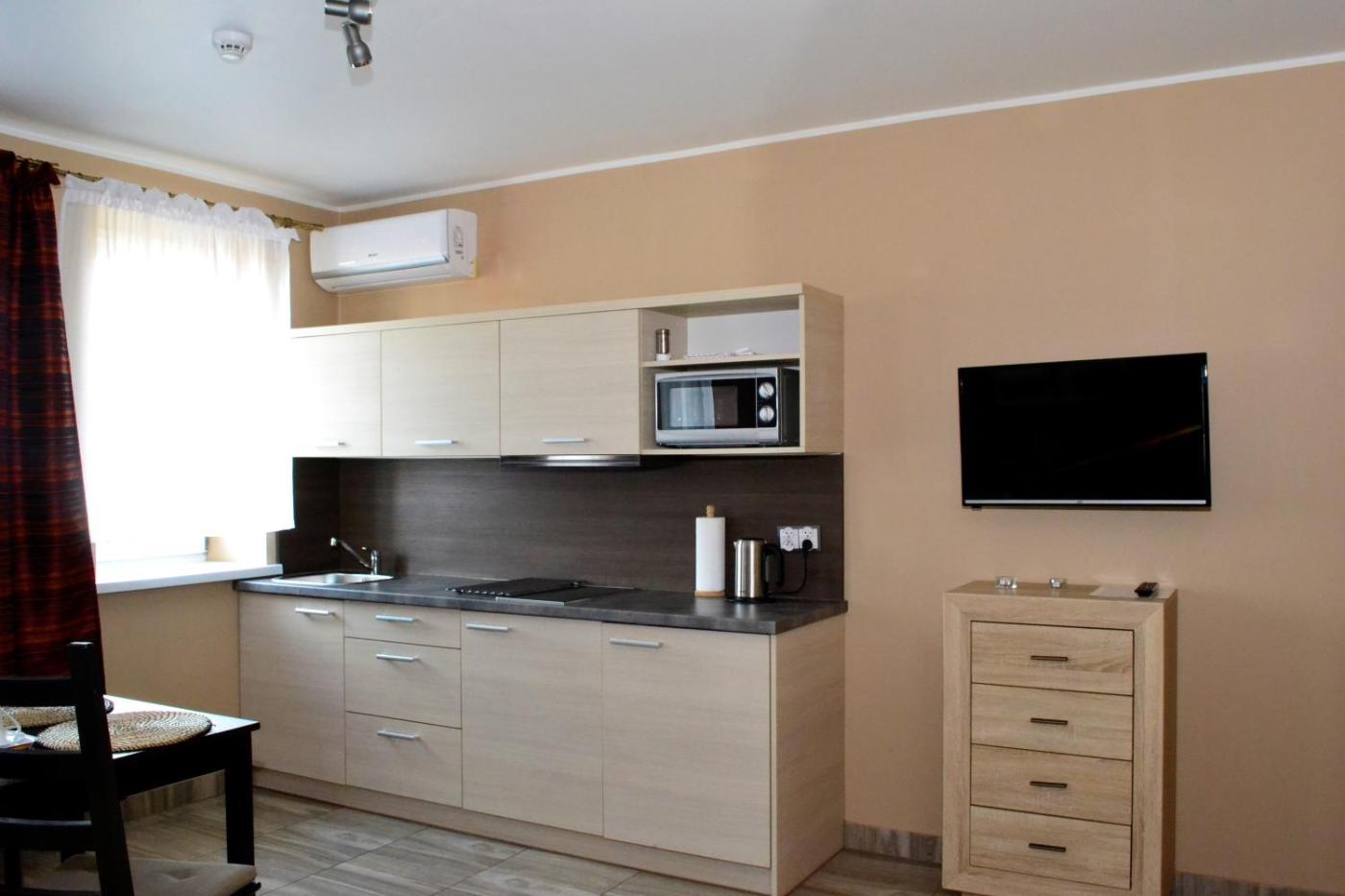 Apartament. The air-conditioned apartment features 1 bedroom and 1 bathroom with a shower and a bidet. Meals can be prepared in the kitchenette, which is fitted with a stovetop, a refrigerator, kitchenware and a microwave. The apartment offers a tea and coffee maker, a wardrobe, a tiled floor, as well as a flat-screen TV. The unit offers 1 bed. Apartament - 2 osobowy. Powierzchnia pokoju ok.: 20 mkw. ;