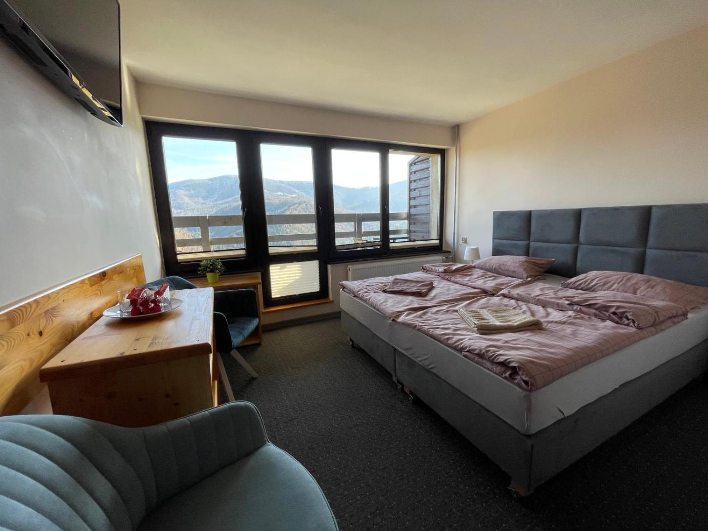 Pokój Dwuosobowy z widokiem na góry. The double room offers a wardrobe, a carpeted floor, a terrace with pool views as well as a private bathroom boasting a shower. The unit has 2 beds. Pokój Dwuosobowy - 2 osobowy. Powierzchnia pokoju ok.: 19 mkw. ;